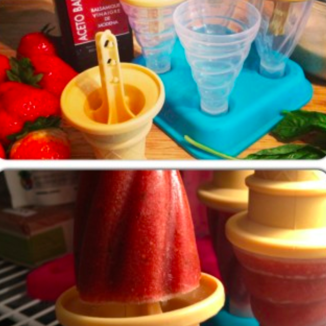 Place strawberries in a glass or plastic bowl with basil. Top with sugar, lemon juice and balsamic vinegar. Toss and let marinate for 1 hour. In blender, puree strawberry-vinegar mixture until smooth. Mix well and pour into ice-pop molds. Insert sticks and freeze for about 8 hours. (Vinegar punches up the flavor without adding fat, while the strawberries loads these icy treats with all the vitamin C you need in a day.)